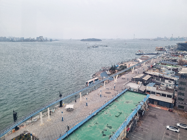 제일 높은 높이에서는 구조물 없이 바다를 조망할 수 있습니다. 시야가 탁 트인 모습이 시원합니다. 저 멀리 공원, 산책로, 영종도를 오가는 배 등등 다 보이네요.