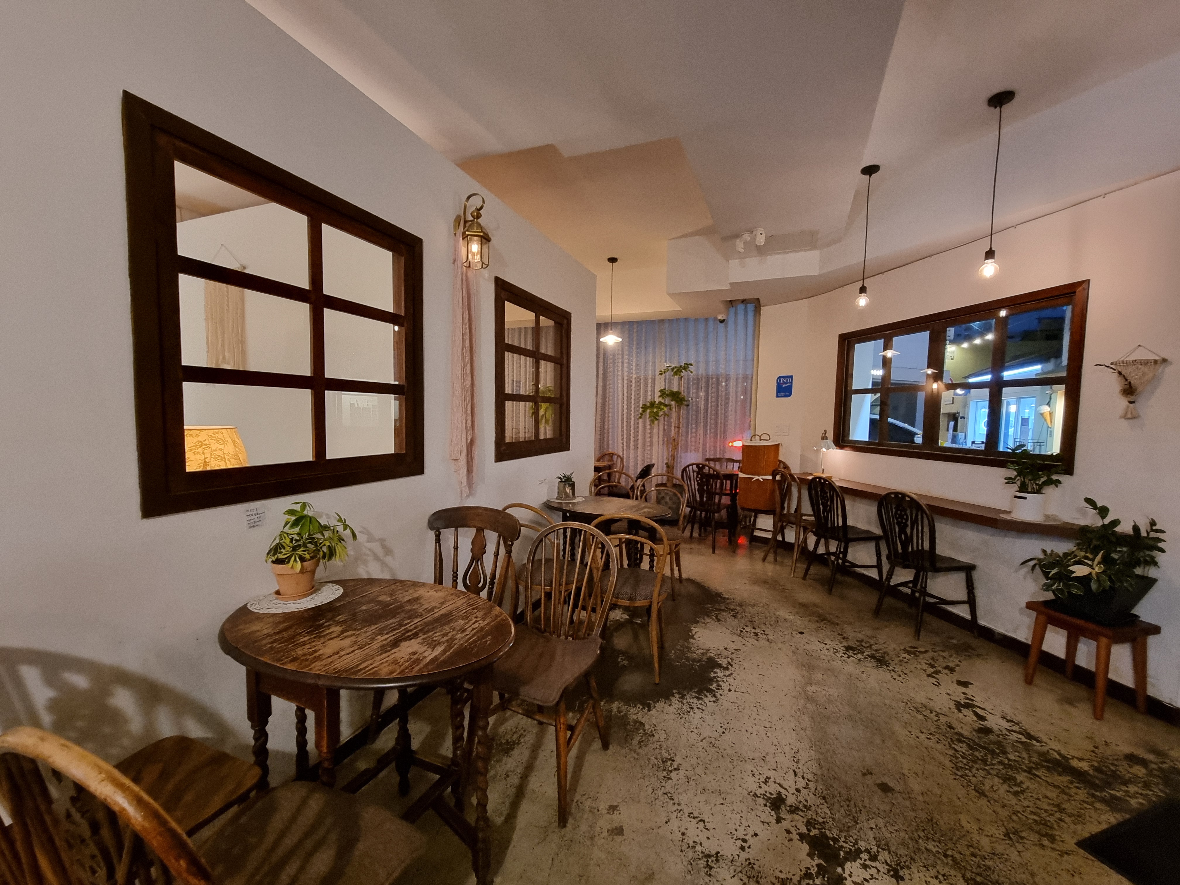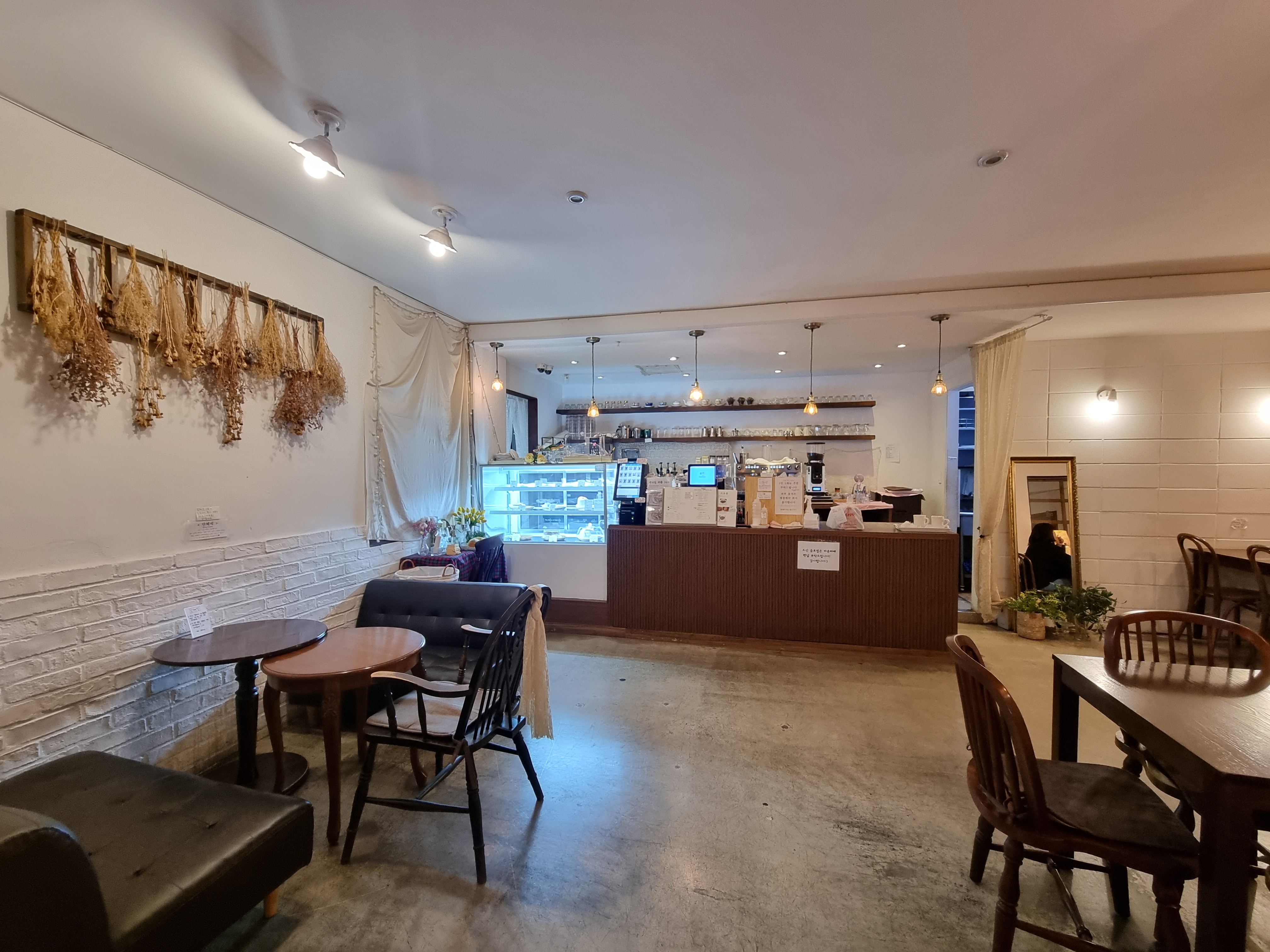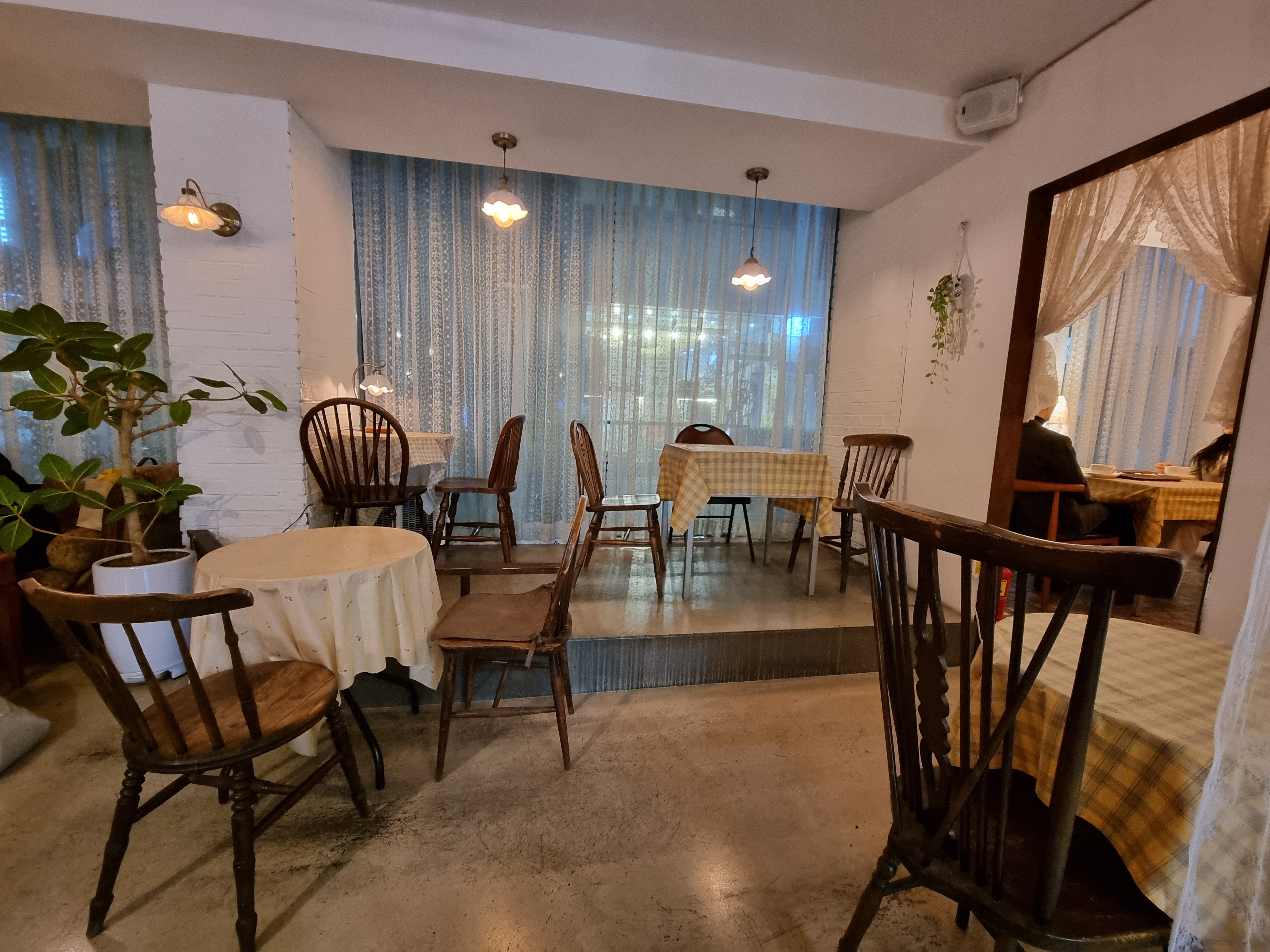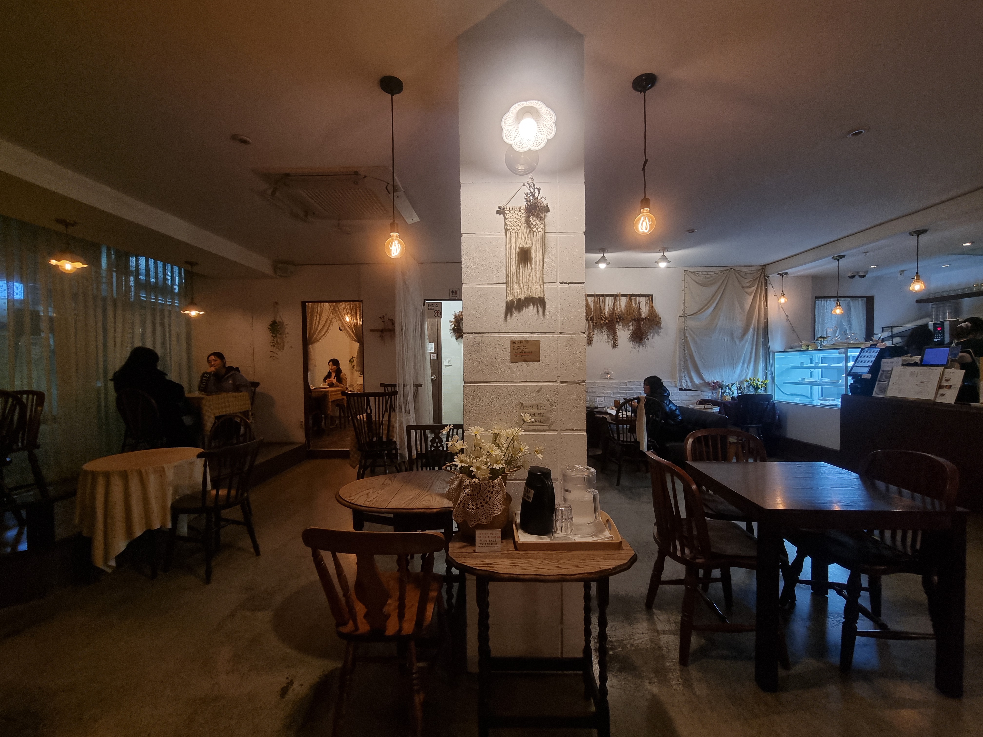 벽에 걸린 드라이플라워 장식이나 빈티지 느낌 조명들, 테이블마다 놓인 귀여운 화분들… 소품 하나하나 신경 쓴 티가 나서 구경하는 재미도 있었어요. 테이블이랑 의자 스타일도 조금씩 달라서, 어디 앉느냐에 따라 다른 분위기로 사진 찍을 수 있는 게 진짜 좋았답니다.