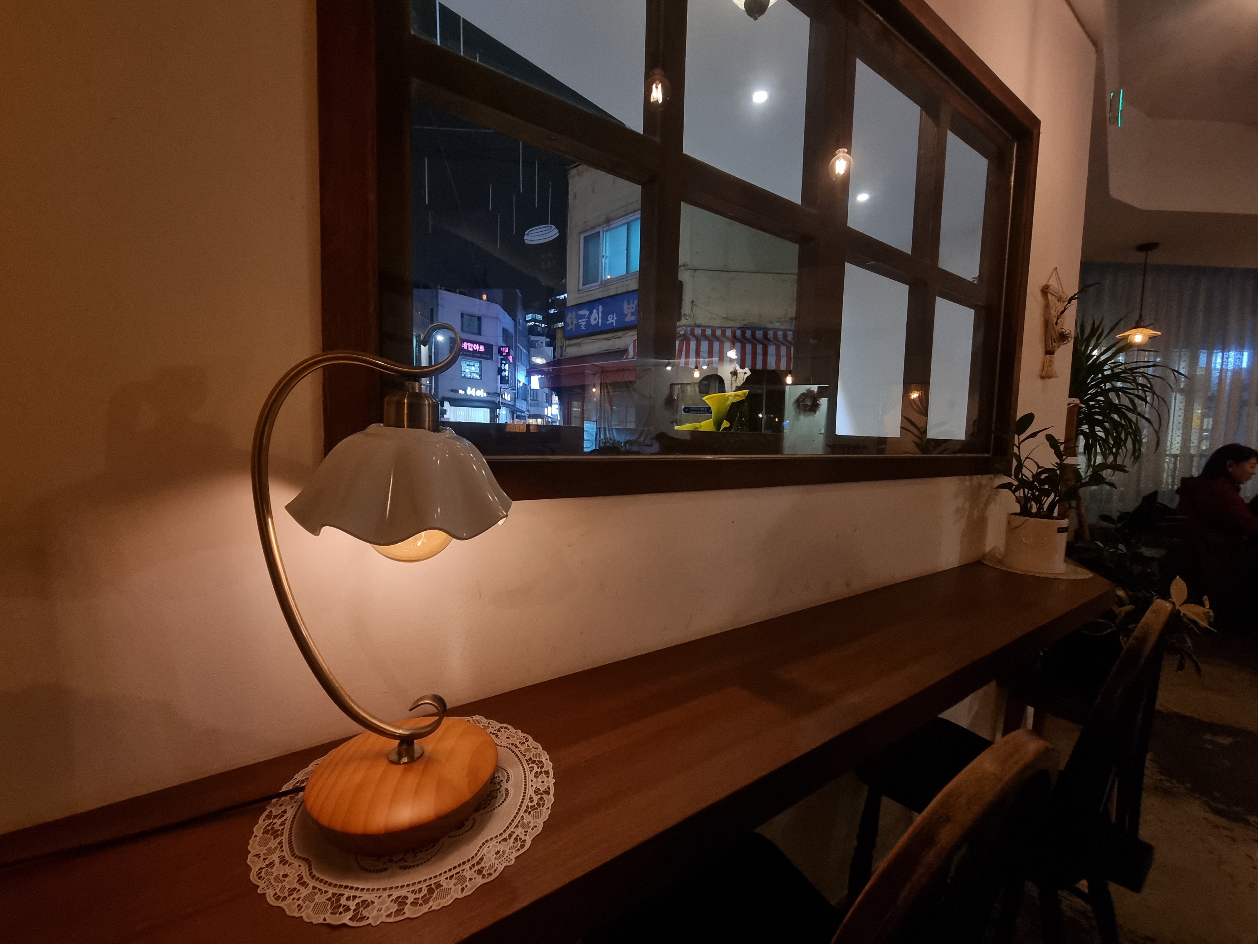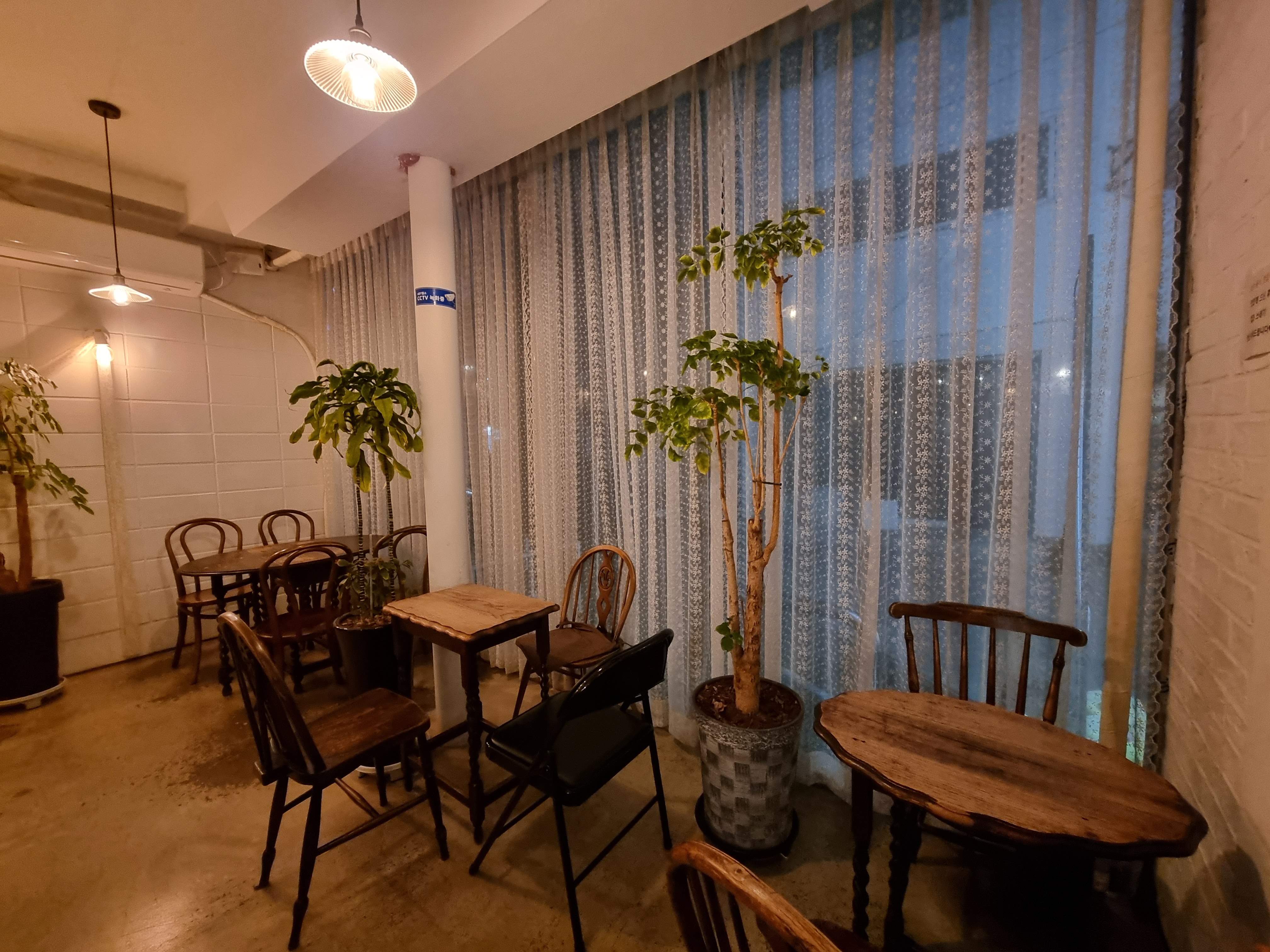 아메리카노와 당충전할 흑임자 케이크까지 야무지게 주문해 봅니다. 카페 이곳저곳을 둘러보며 사진을 찍었어요. 꽤 늦은 시간이었는데도 손님들이 많았습니다. 손님이 없는 곳만 고르고 골라 촬영을 했기 때문에 사진에는 마치 저 혼자인 것 같아요. 안쪽에는 체크 테이블보랑 하늘하늘 레이스 커튼으로 꾸며진 비밀스러운(?) 공간도 있어요! 여기 앉으면 뭔가 아늑하고 특별한 느낌이 듭니다.