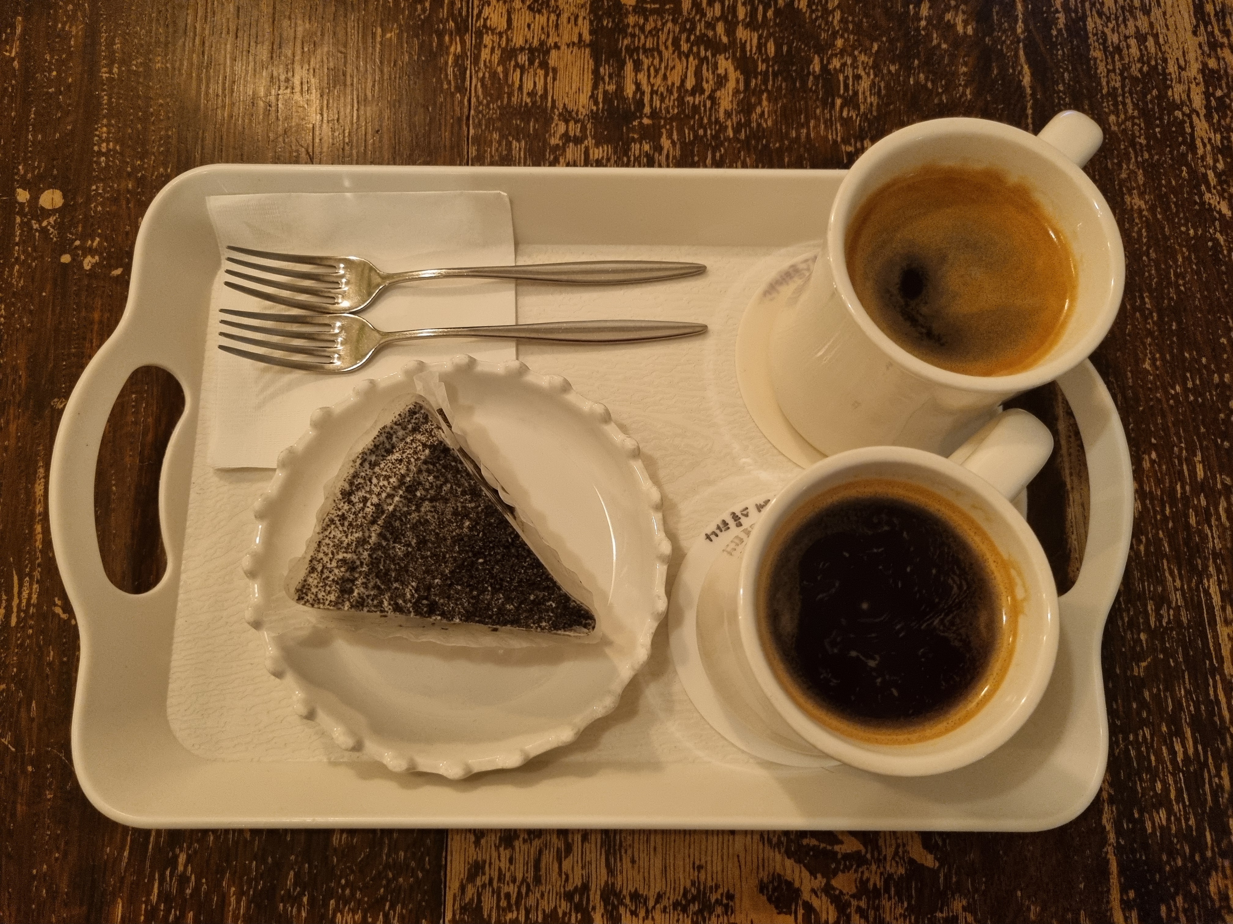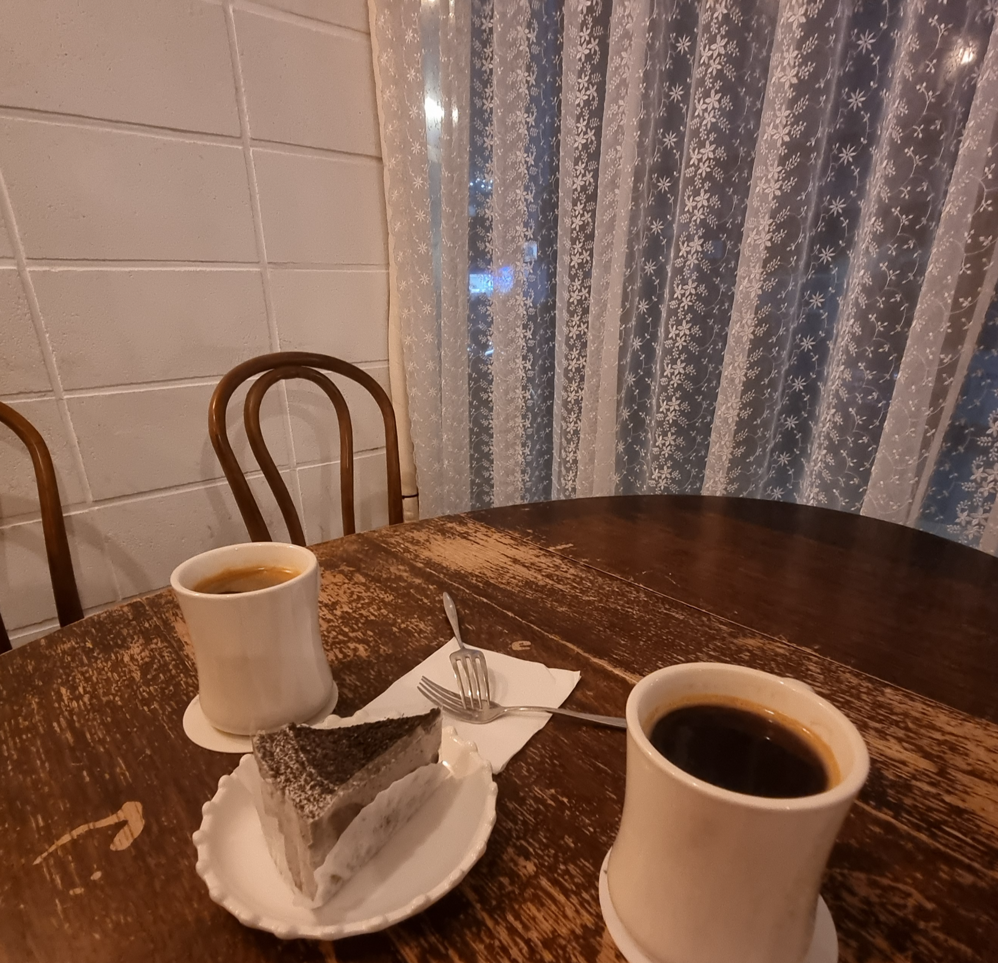 여기저기 사진을 찍으며 다니다 보니 진동벨이 울리네요! 비가 살짝 내려서 쌀쌀한 탓에 따뜻한 커피를 주문했습니다. 고소한 맛이 커피마저 취향저격입니다. 흑임자 크림이 덮인 케이크는 맛이 떡 같을까 봐 걱정했는데 전혀! 산뜻하고 가벼운 정도의 당도에 부담스럽지 않은 맛있는 케이크였습니다.