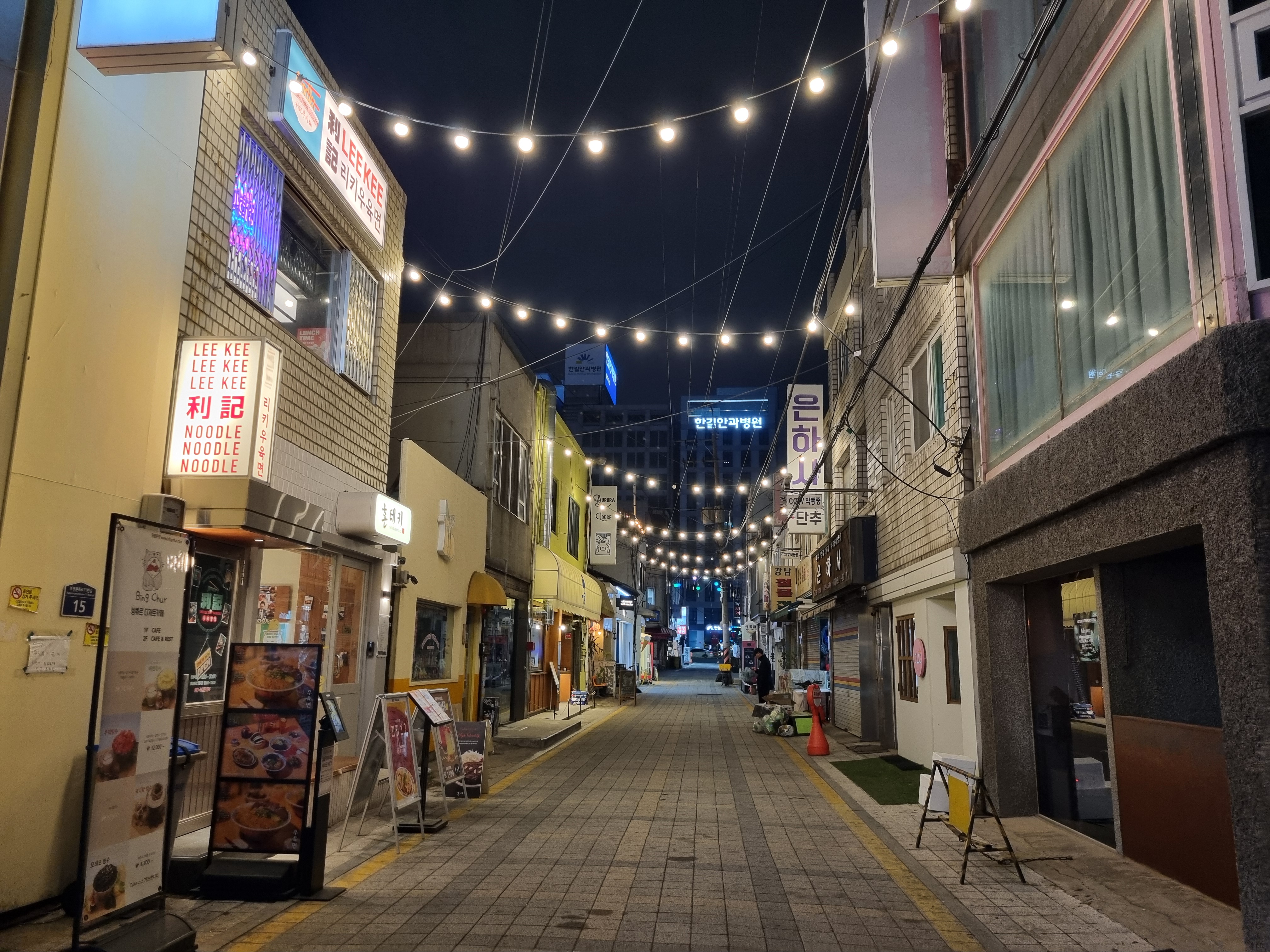 부평에는 카페거리가 있다고 해서 찾아가 보았습니다. 평리단길이라는 별칭이 붙은 이곳은 와인바나 카페들과 기존의 오래된 가게들이 어우러진 모습입니다. 알전구로 데코를 해놓아서 멀리서도 쉽게 찾을 수 있었어요.