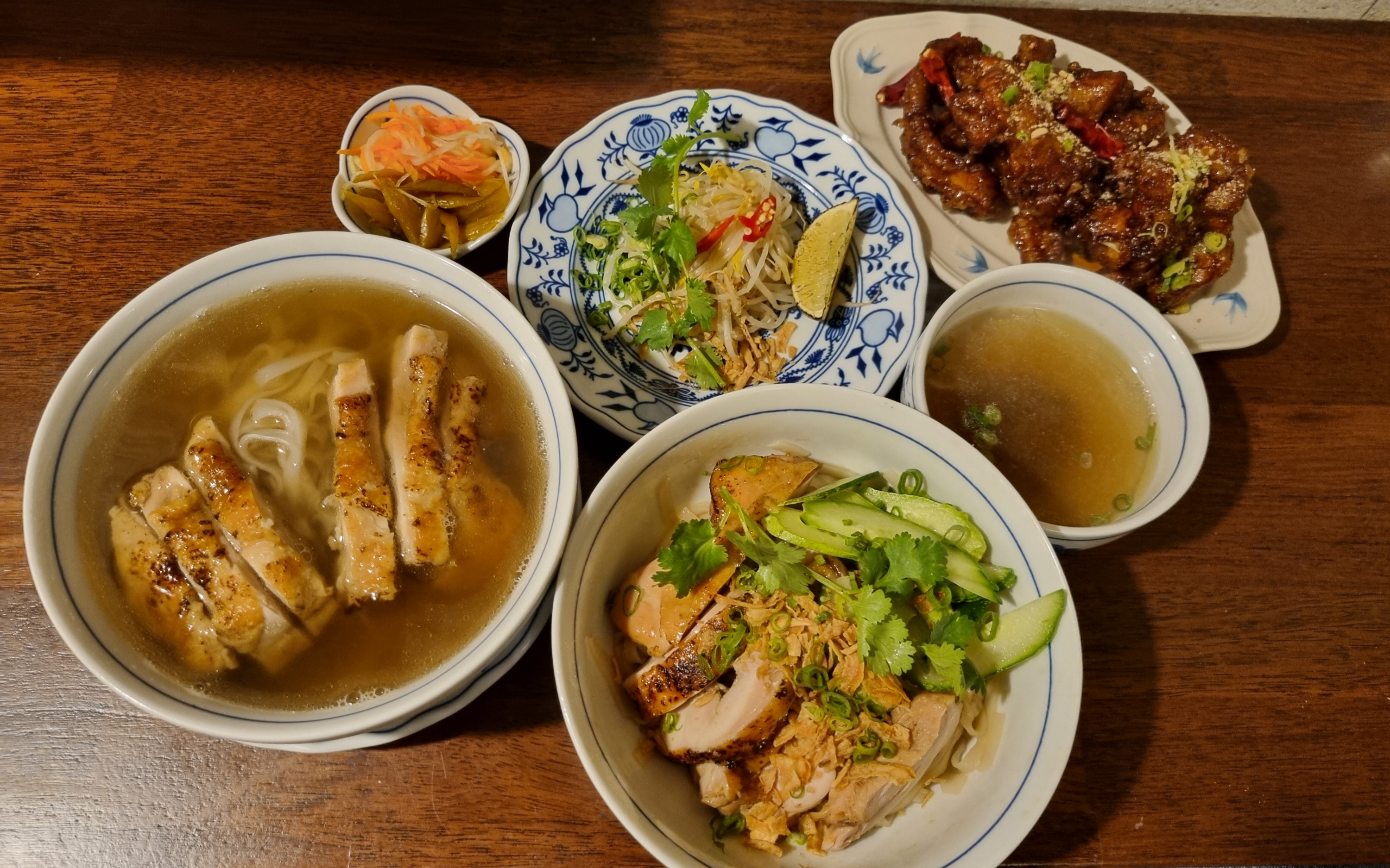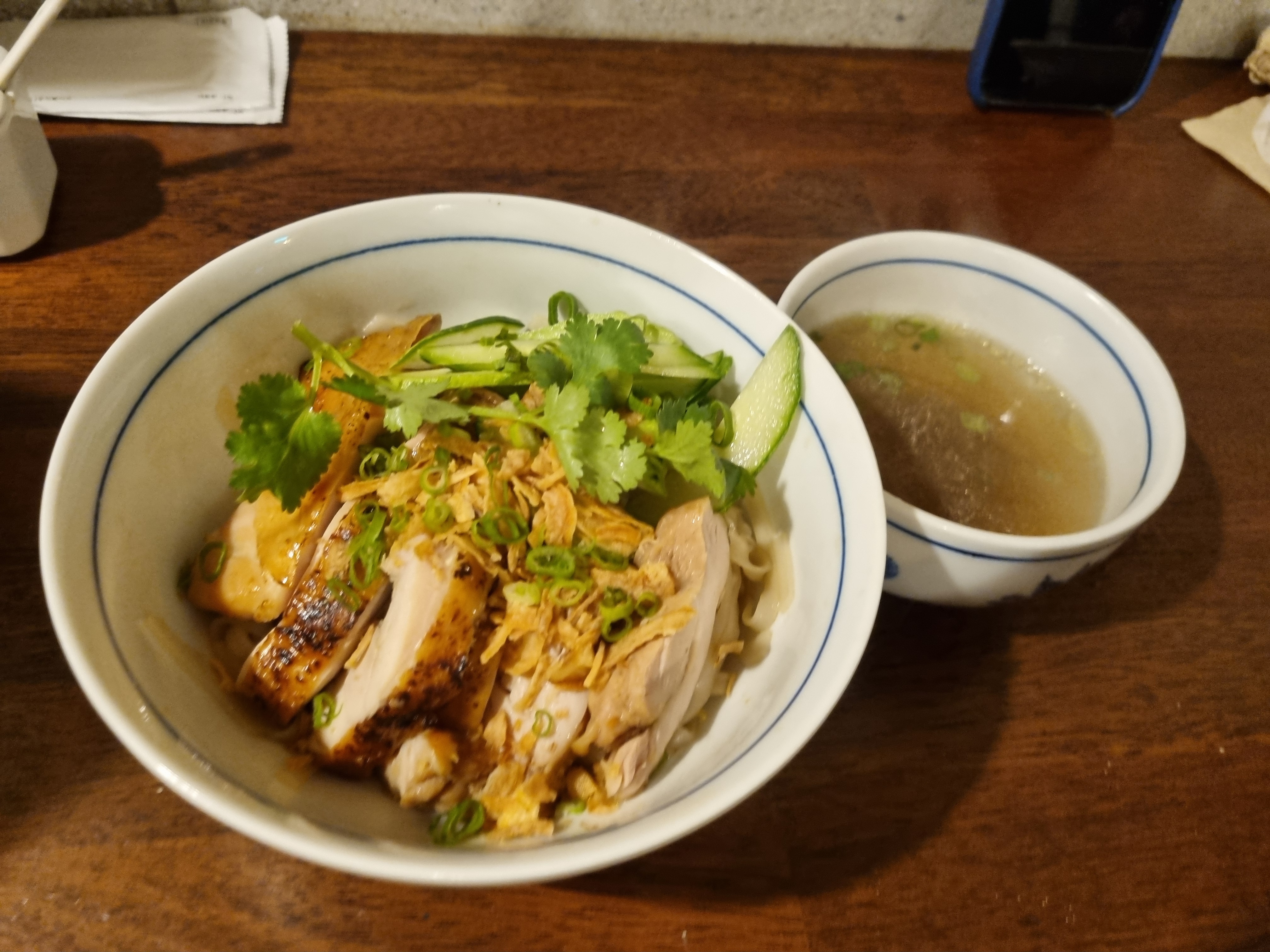 여러분이 궁금해 하실 것 같아 시킨 치킨 비빔면은 쌀국수보다 더 인상 깊었던 메뉴입니다. 소스가 면에 잘 배어 있고 역시 구운 닭다리살이 등장합니다. 위에 뿌려진 바삭한 어니언(?) 칩과 고수까지 더해지니 풍성한 맛이었습니다. 따로 나오는 맑은 국물로 깔끔하게 마무리할 수 있어요.