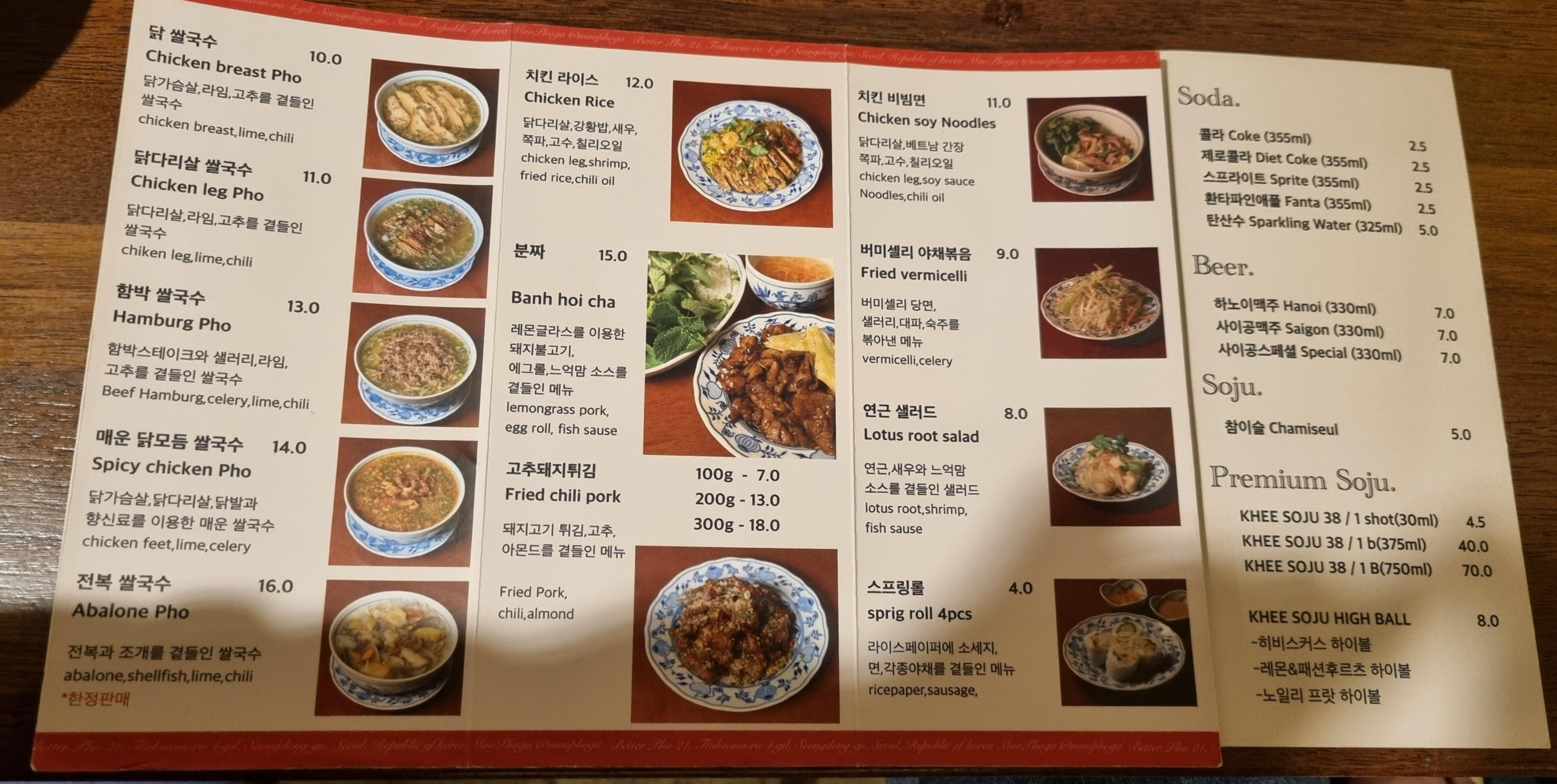메뉴판은 음료와 음식으로 나뉘어져 있어요. 앞뒤로 골고루 찍어보았습니다. 비쌀 것 같은 예상과는 달리 가격대는 무난한 것 같아요. 성수동에서 이 정도의 가격에 한 끼면 가성비 있다고 생각합니다. 일단 배가 고파서 주문을 넣어봅니다. 메인으로 보이는 닭다리살 쌀국수, 치킨 비빔면, 안성재 셰프가 꼭 먹어보라고 강력 추천했던 고추돼지튀김 200g을 시켰어요.