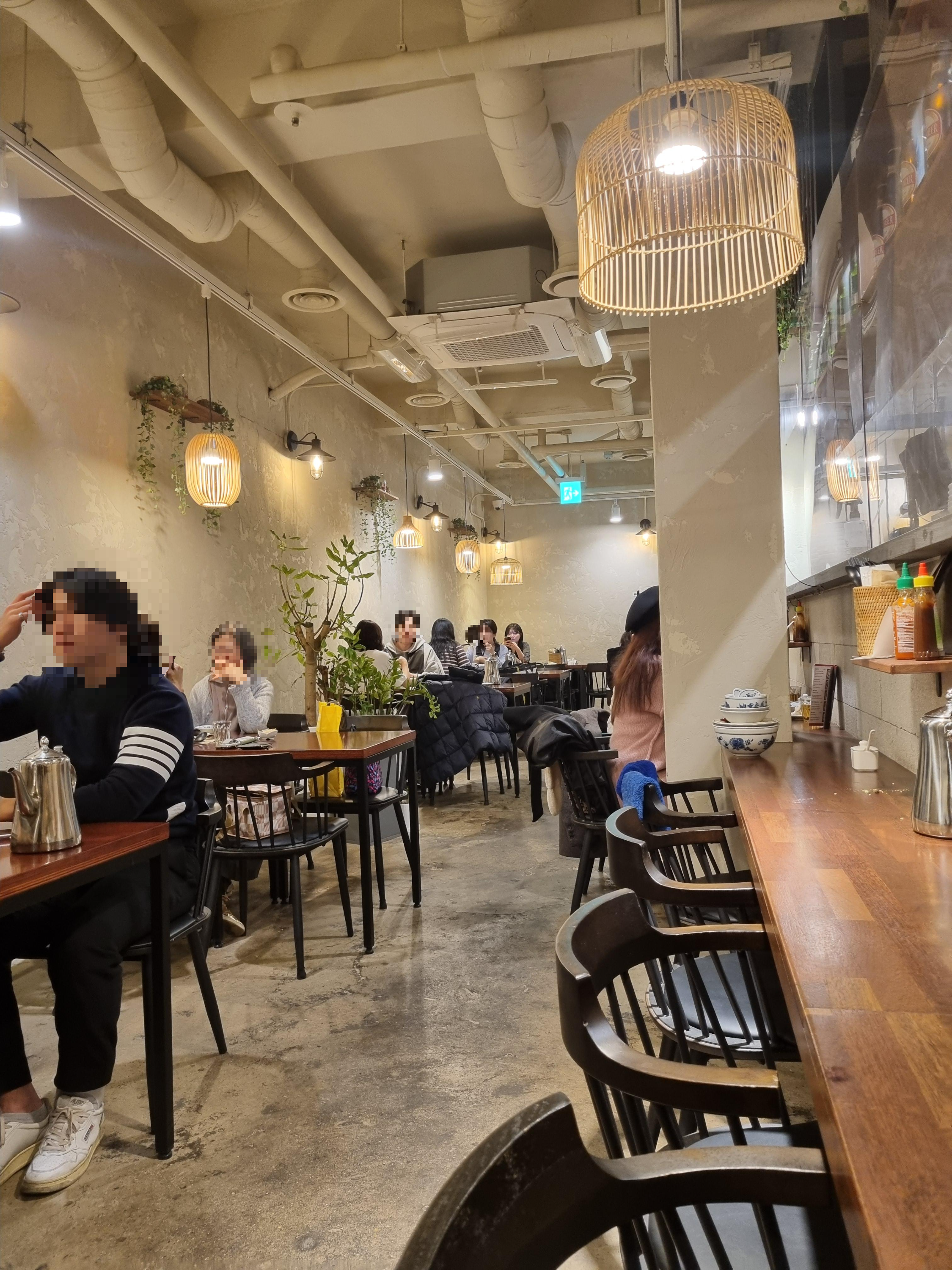 메뉴를 기다리면서 매장을 둘러보았습니다. 내부는 따뜻한 조명과 나무 소재 인테리어로 편안한 분위기입니다. 테이블 간격도 넉넉해서 여유롭게 식사할 수 있습니다. 주말이라 커플들이 많았어요. 테이블의 규격으론 가족 단위의 식사도 가능하고 제가 앉았던 바 테이블도 있어서 혼밥도 부담이 없습니다. 조명이 이 음식점의 정체성을 잘 보여주고 있어요.