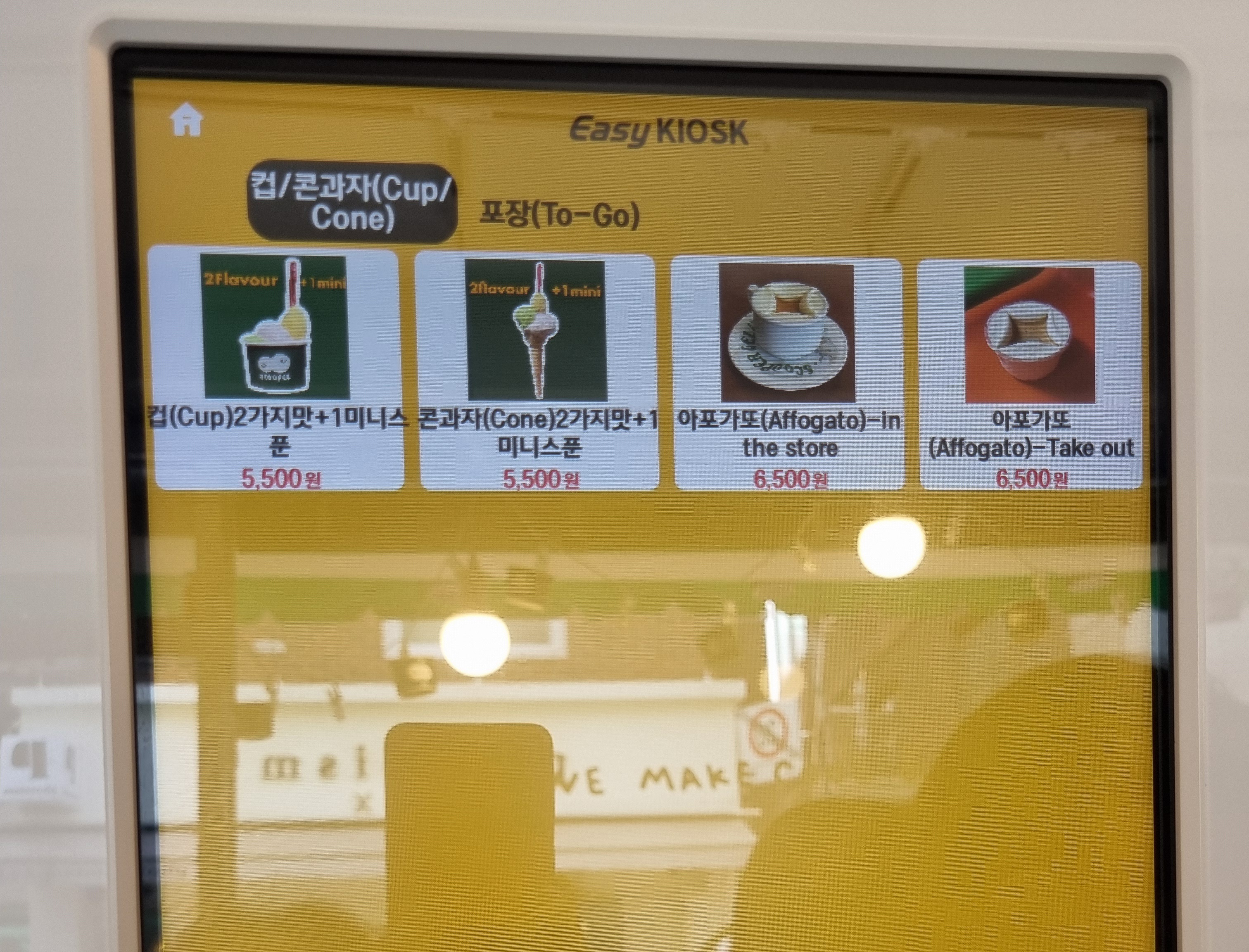 오늘 저의 선택은 젤라또도 아니고 그냥 커피도 아닌 아포가토! 주문은 키오스크로 할 수 있습니다. 대략적인 가격 확인해 보세요. 매장에서 드실 수도 있고 테이크 아웃도 가능합니다.