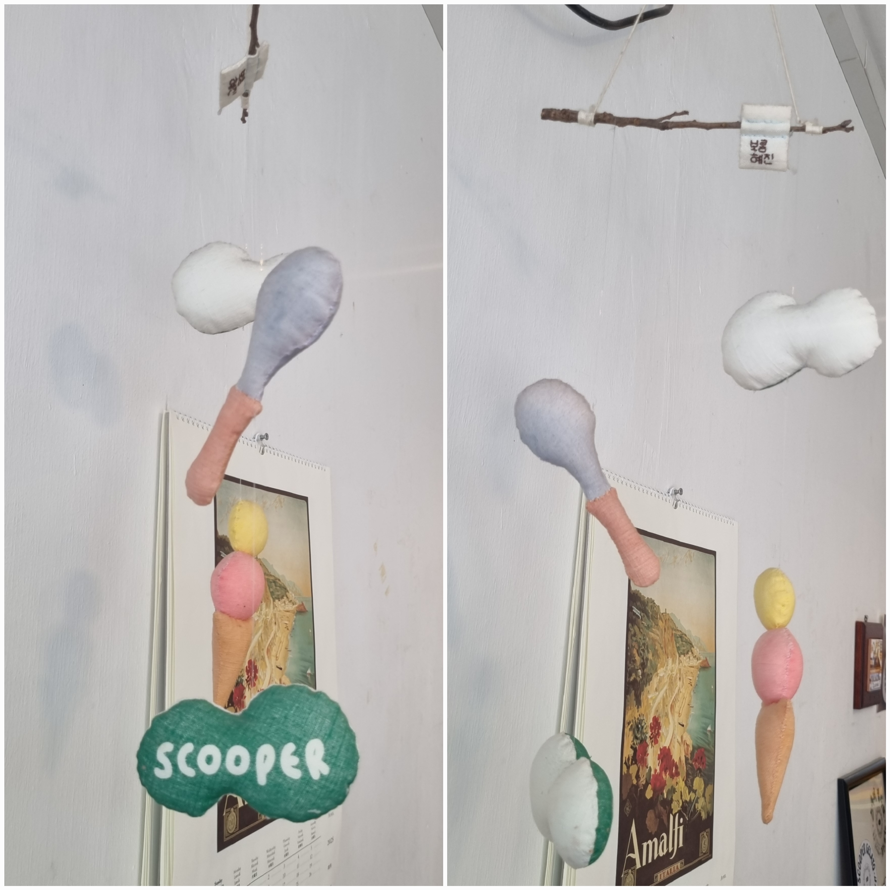 매장을 들어서면 천으로 만든 귀여운 모빌이 맞이해 줍니다. 스쿠퍼젤라또의 귀여우면서도 자연주의적 느낌이 담긴 것 같아요.