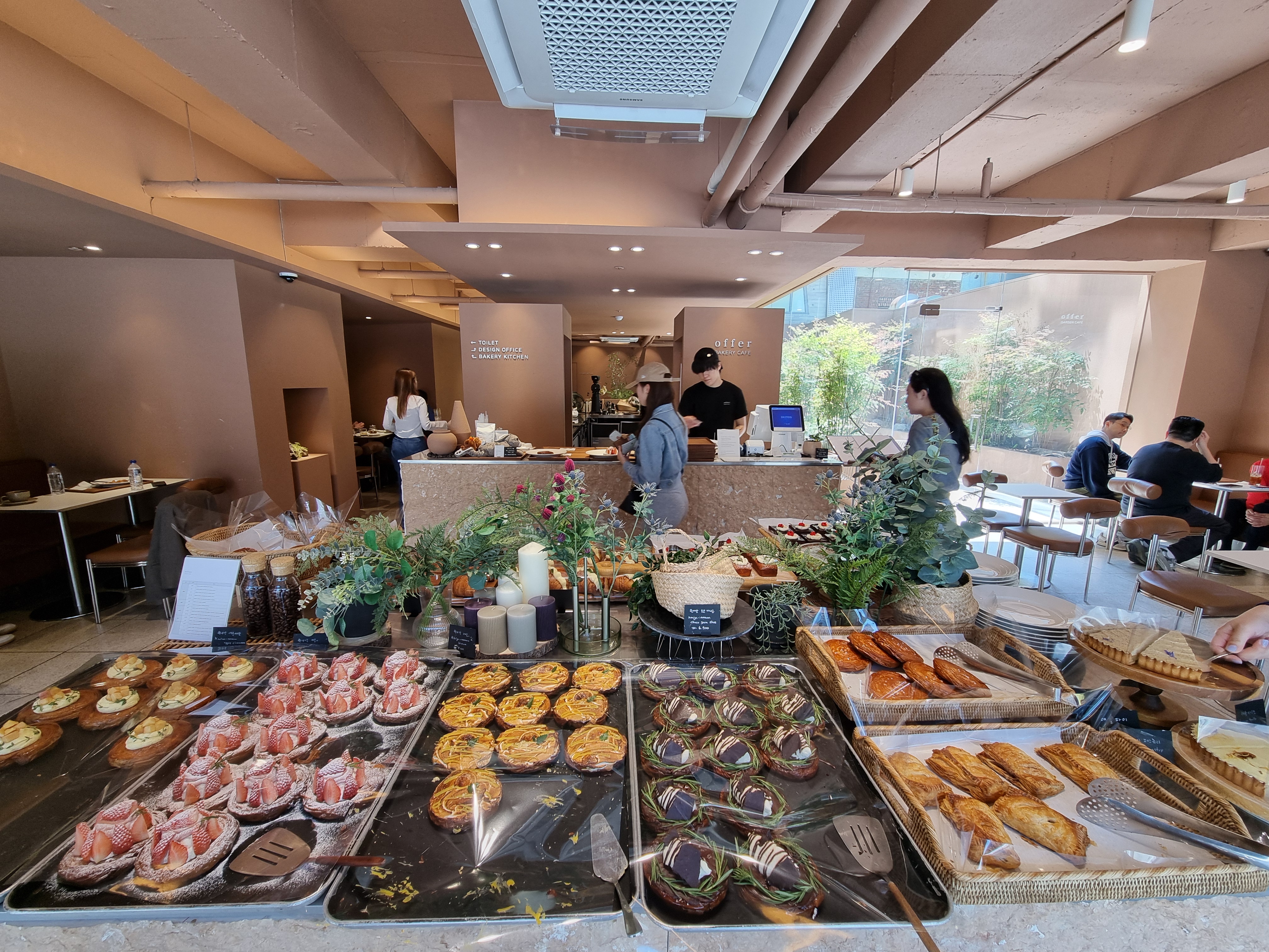 매장 안쪽의 가운데에는 실내 화단이 분위기를 주도하고 있습니다. 잎사귀가 크지 않은 식물들이 심어져 있는데 이곳의 느낌과 잘 어우러져 있습니다. 컬러감이 좋아서 사진을 찍으면 잘나오네요. 포토존으로도 손색이 없을 것 같습니다.