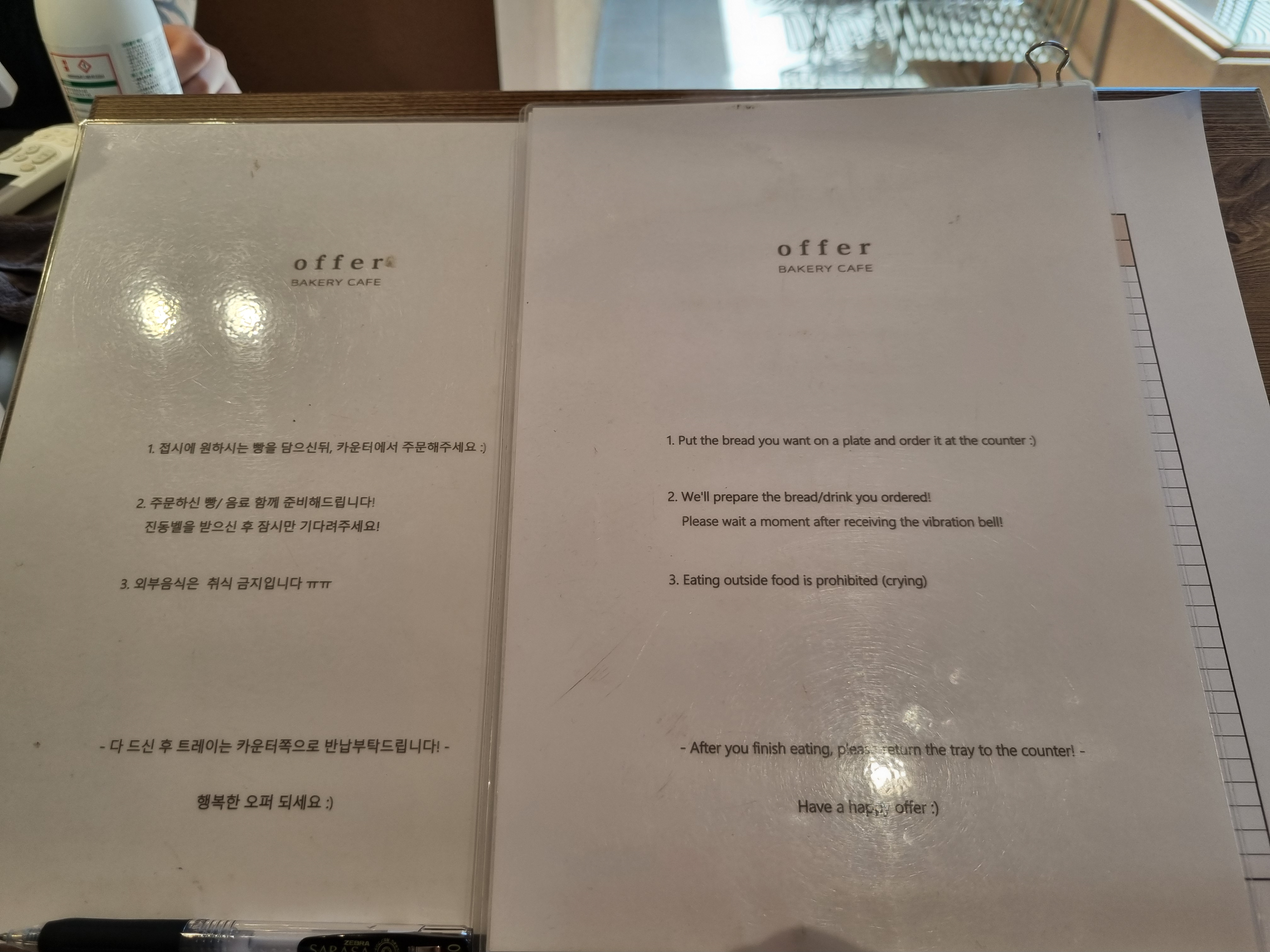 오퍼에서 질서유지를 위해 카페 사용 설명서를 비치했네요. 외부 음식물 취식 금지이고 다 드신 것은 반납해 주시는 매너!