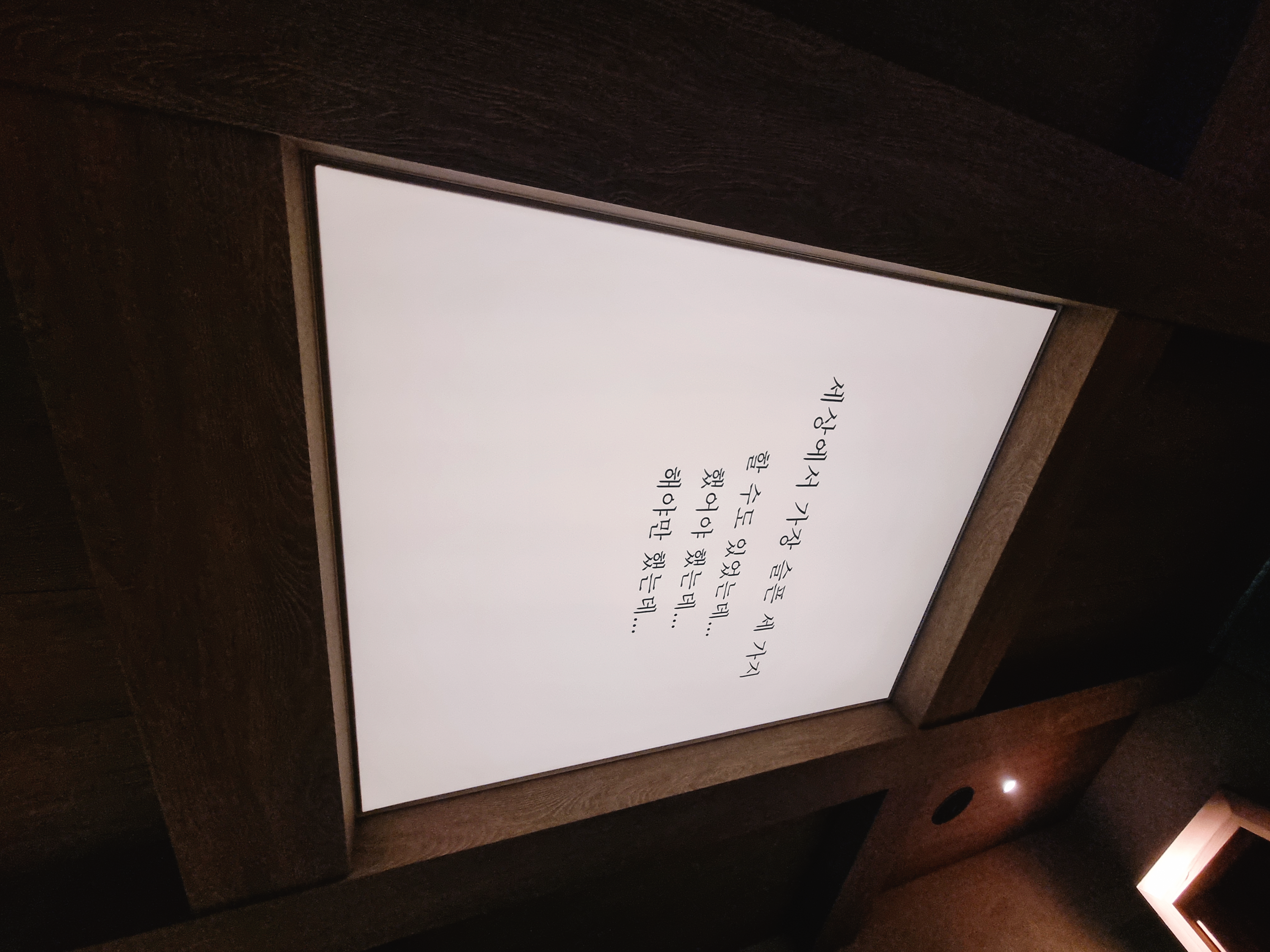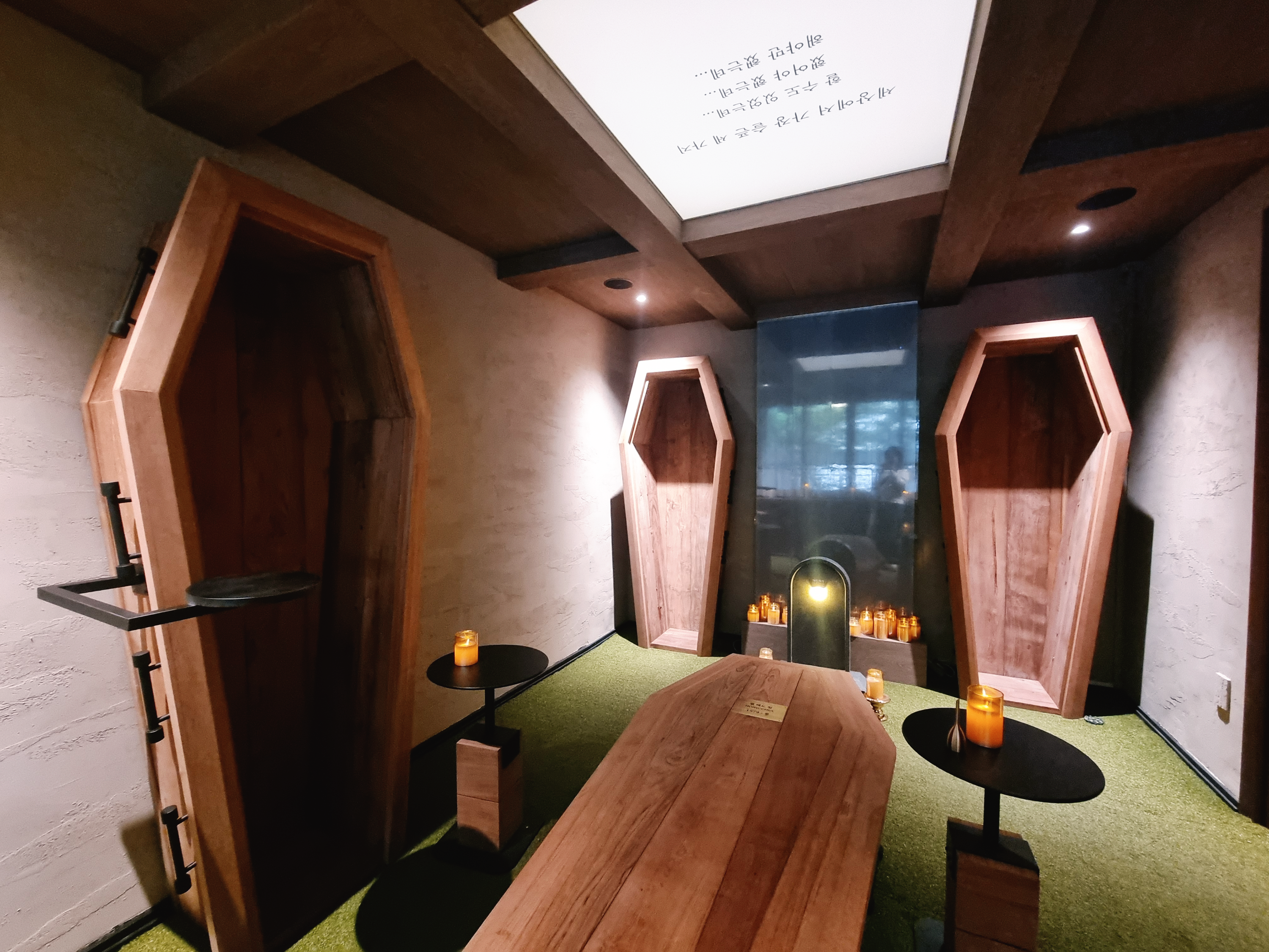 극장을 나와서 건너편에는 관들을 세워둔 방이 나옵니다. 죽음에 대해 생각해 보는 공간인가 봅니다. 사실 죽음은 항상 우리와 공존하고 있는 존재이긴 한데 이렇게 직접적으로 표현한 것은 다소 생소한 광경인지라 신기했습니다. 저기 앞에 두 개의 관 사이에 있는 검은색은 스크린입니다. 그 앞에 불빛이 센서인데 누군가 지나가면 스크린에 노홍철예수(?)가 등장하고 웃음소리도 들려요. 처음엔 조금 놀랐지만 노홍철 씨 특유의 풍자적이고 실험적인 감성이 드러난 공간 같았어요.