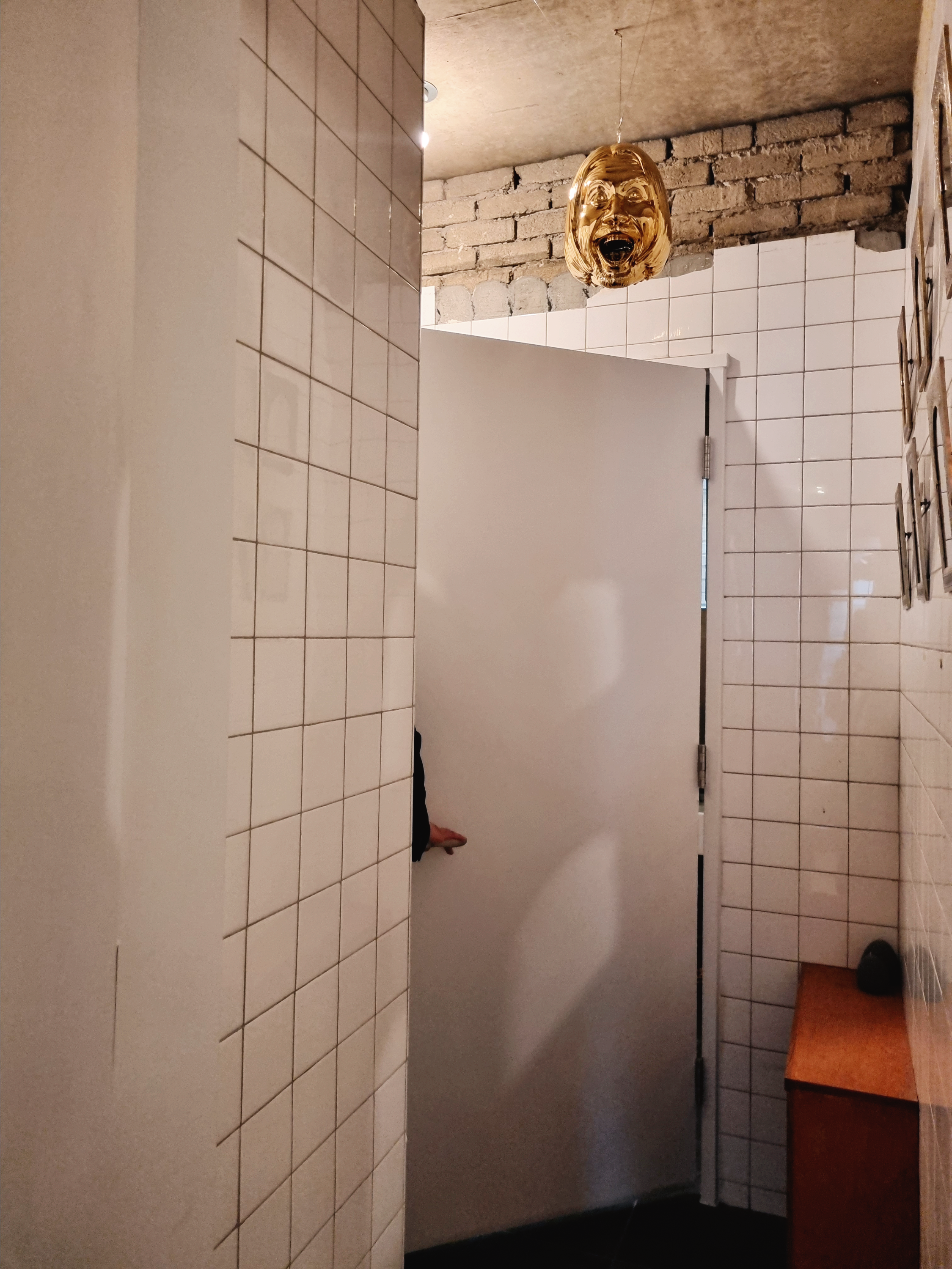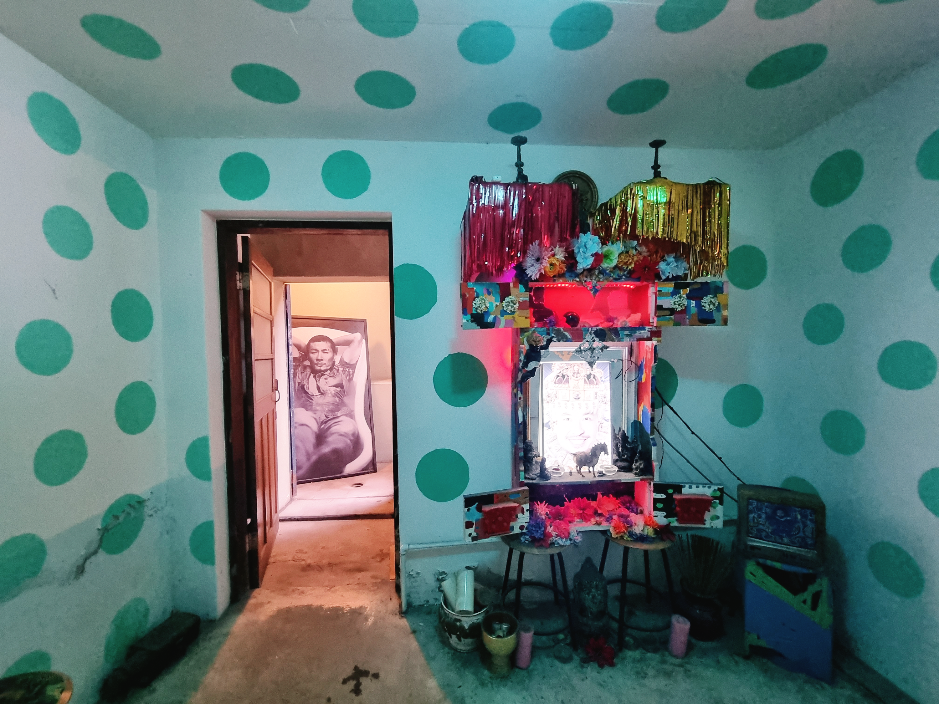 초상화 맞은편에는 이런 사당 같은 느낌의 무언가가 놓여 있었습니다. 스스로 이런 기획을 했을 텐데 감성이 정말 독특했습니다. 문 밖에 보이는 저 욕조샷을 보고 깜짝 놀랐어요. 생각보다 진지한 표정에 그렇지 못한 상황이 아이러니하게 느껴졌습니다.