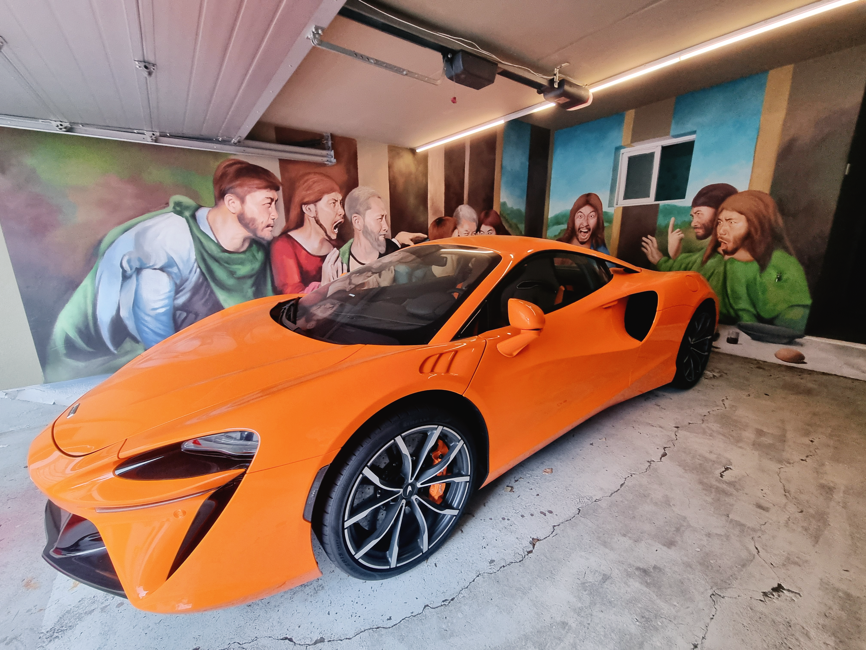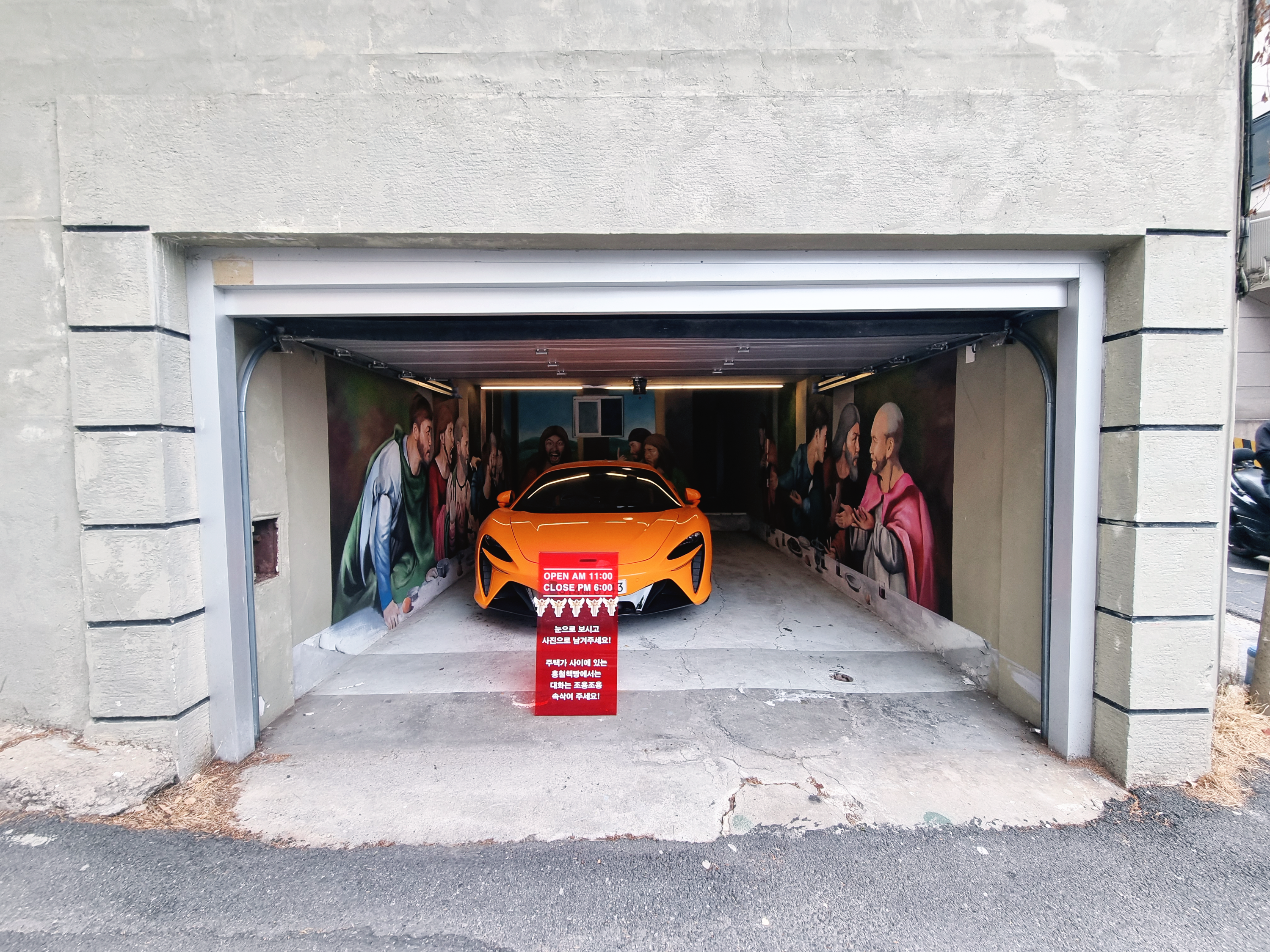 입구로 설정되어 있는(?) 주차장 공간에는 샛노란 스포츠카 한 대가 놓여 있었습니다. 벽화로는 최후의 만찬 그림을 또 패러디해두었네요. 사실 이 카페 주변 가까이에 교회가 2개 정도 있었던 것 같은데 그 사이에 이런 공간을 만든 게 재미있게 느껴졌습니다. 노홍철 씨가 예전에 텔레비젼 프로그램에서 나를 믿으라~! 했던 장면도 떠올랐어요.