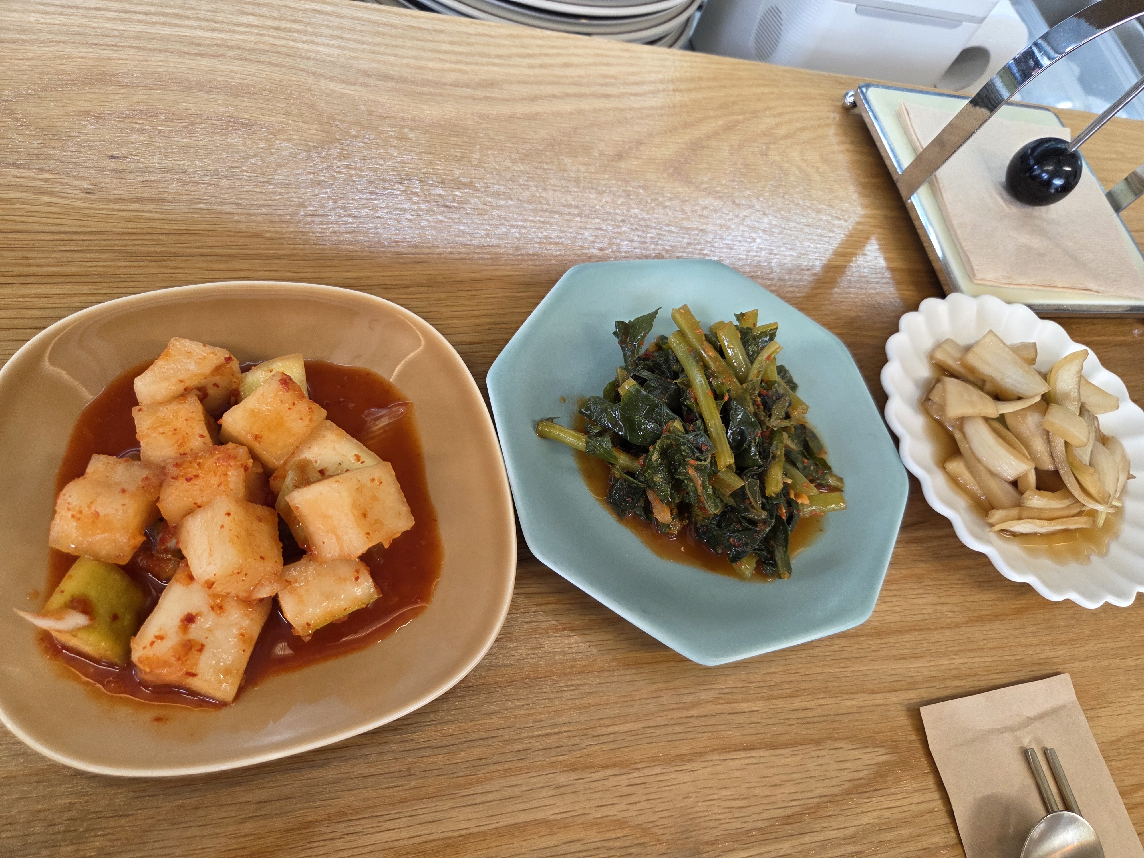 메뉴를 주문하고 기다리고 있으니 밑반찬 3종 세트가 나왔어요. 반찬들도 모두 깔끔합니다. 특히 열무김치가 콩국수랑 찰떡궁합이었어요!